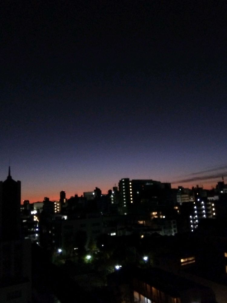 西の空に薄っすらピンク色に染まった富士山が見えています