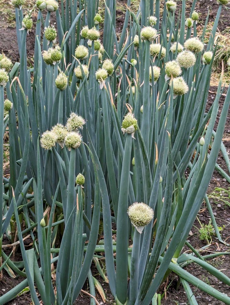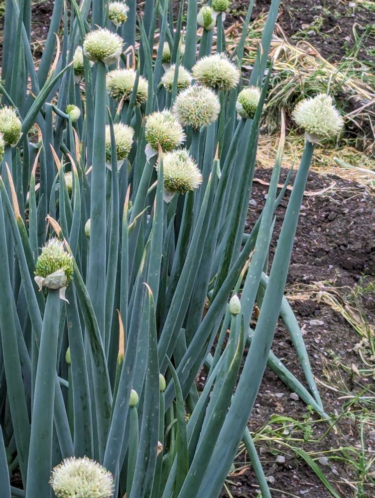 ネギの葉のてっぺんに白く丸い形に咲く、ネギの花の集まりのネギ坊主です✋
