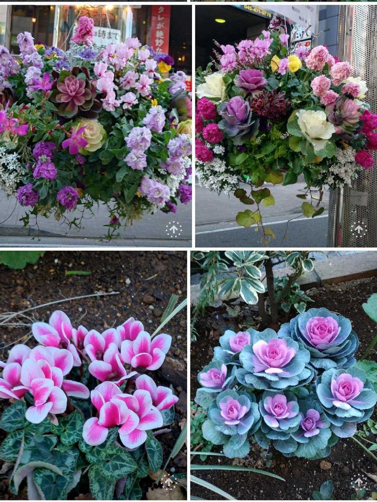❶スタジアム通りのハンギングバスケットとその下の花壇のシクラメン葉牡丹🩷