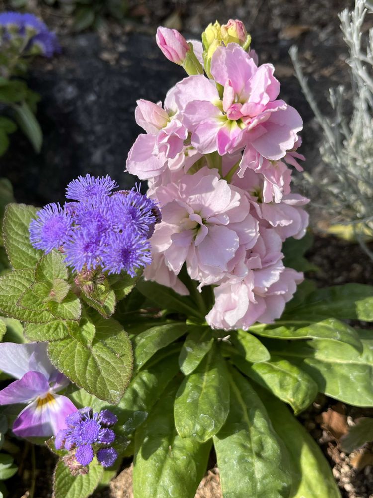 地植えのピンク、八重ストック🌸🍃🌸隣りは夏からモリモリのアゲラタム💜さん٩(๑❛ᴗ❛๑)۶💕