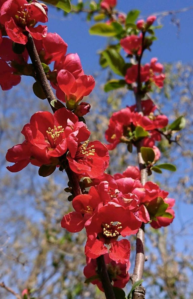 バラ科ボケ属の落葉低木。平安時代初期に中国から渡来したといわれ、薬用植物として栽培されていた。古くから庭木として観賞用に植栽される。江戸時代以降に品種改良が進み現在200を越える品種が栽培される。一輪の花に複数の色が入る『咲き分け品種』、日光によって花の色が変わる『色変化品種』などがある。高さが1m以下の日本固有種の草木瓜(クサボケ)もある。花期は3~4月。葉が出る前に枝いっぱいに花をつける。花は直径2~5㎝の5弁花で花色は豊富。へら形の葉が束状につき、短い枝に刺があるのが特徴。夏に10㎝ほどの楕円形の果実が熟し、果実酒として利用され疲労回復に効果があるとされる。ボケの果実酒は楊貴妃が飲んでいたという。カリン、ボケ、クサボケではクサボケの果実酒が一番香りと味が良い。