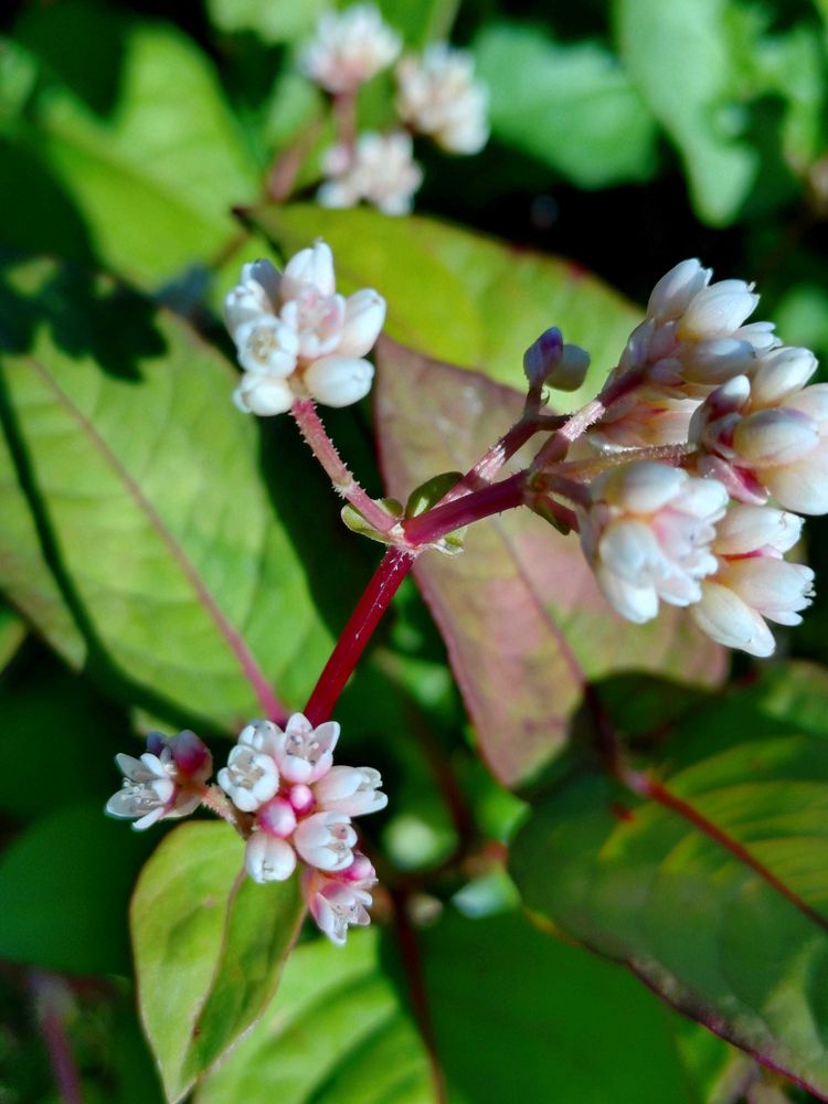 茎が赤色でよく目立ちお花をみたら咲いてるのもあり撮って見たらミゾソバを少し大きくしたような感じの可愛いお花に それと共に花後ともおもわれる黒色の実?果実?が艷やかにできてました