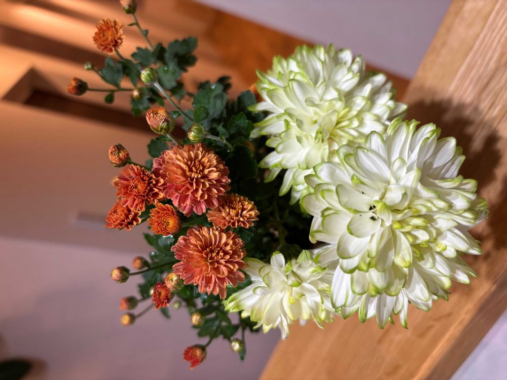 菊をいただきました。白い菊もオレンジの菊も名前が分かりません。ご存知の方は教えてください。よろしくお願いします。
