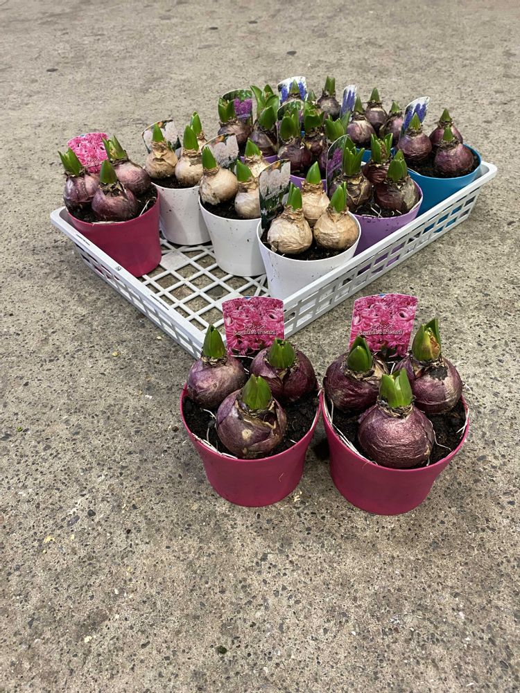 今年もヒヤシンスがスタートしました。3球植えなので、いろんな使い方ができますね。