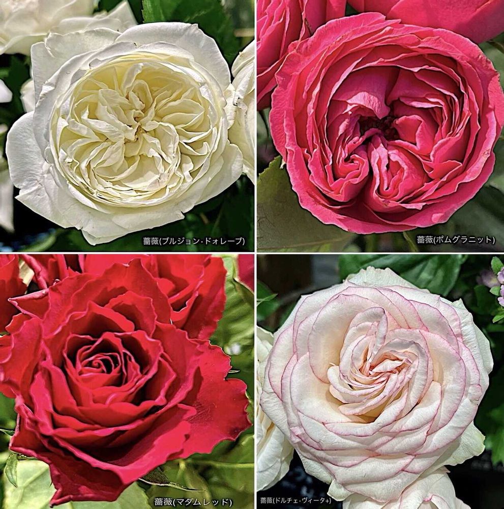 白系x1、ピンク系x1、赤系x1、混色(複色)系x1のバラ、4つ。