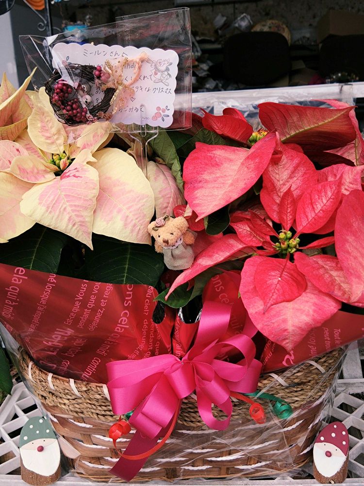 ミールンさんに何を贈ろうか?とお花屋さんに行って、斑入りのポインセチアに一目惚れ😍💘ちょうど赤と白1つずつあったので🧺に入れて頂きました~☺️💞