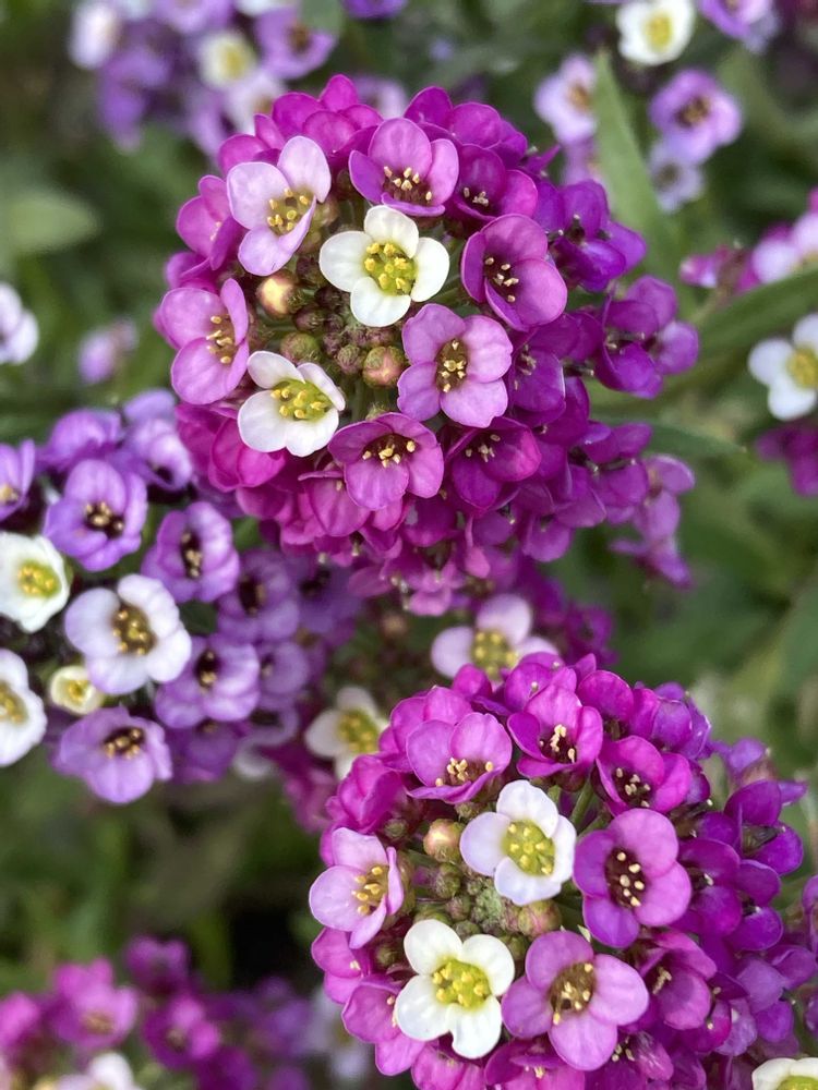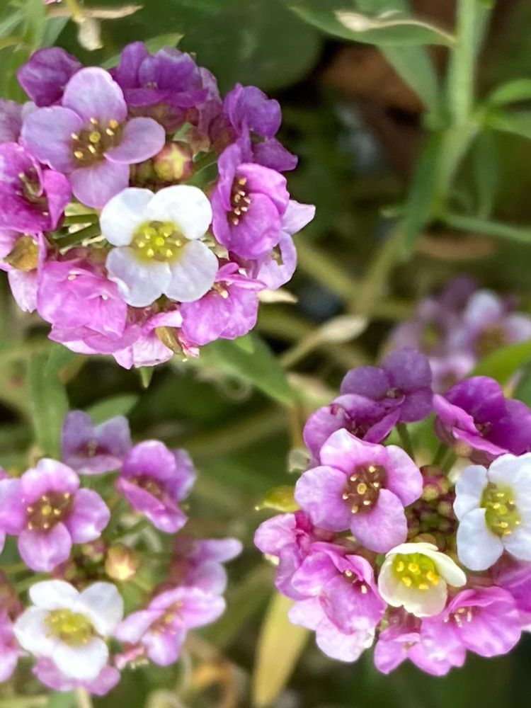 さて、かわいい花を見つけたので、記念撮影😍スィートアリッサムの紫、白、桃色と色とりどり咲いていて目を楽しませてくれました♪♪♪