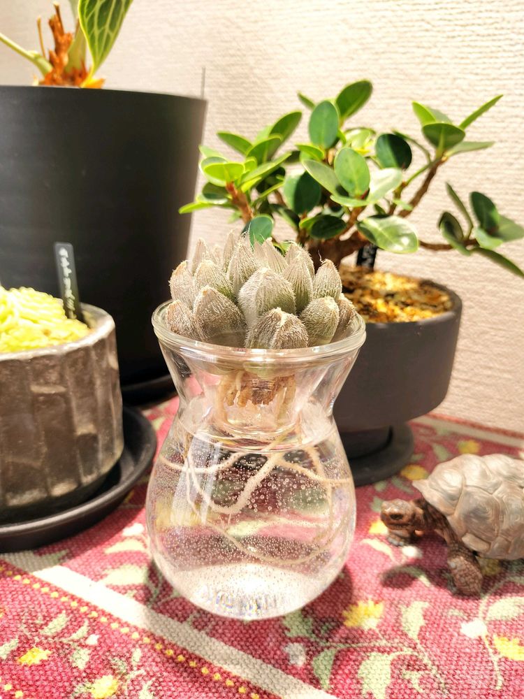恐る恐る抜いてみて、根腐れではなかったけど、外葉が萎びかけていたので水耕にしてみました💧