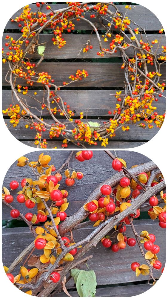 うちの駐車場横で、ツルウメモドキが自生してて今年は剪定忘れて伸び放題なんです☺️