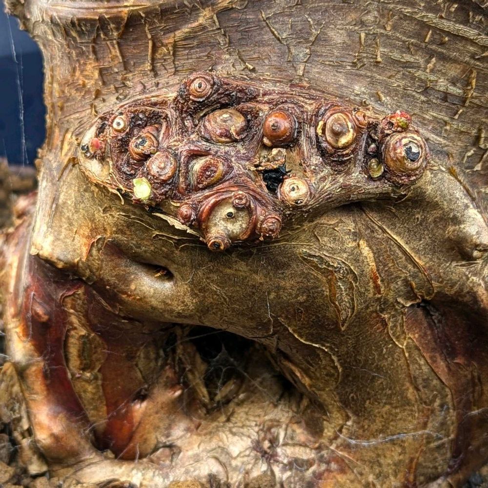 親株は20年程前、寒波で凍傷にかかり、幹の上がやられ、空洞まで、出来ました。