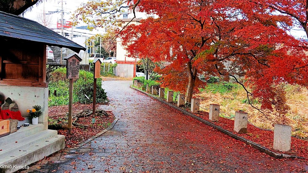 初雪が降った今日、南郷地蔵前の楓も、散りぞめの有終の美を飾っていました。