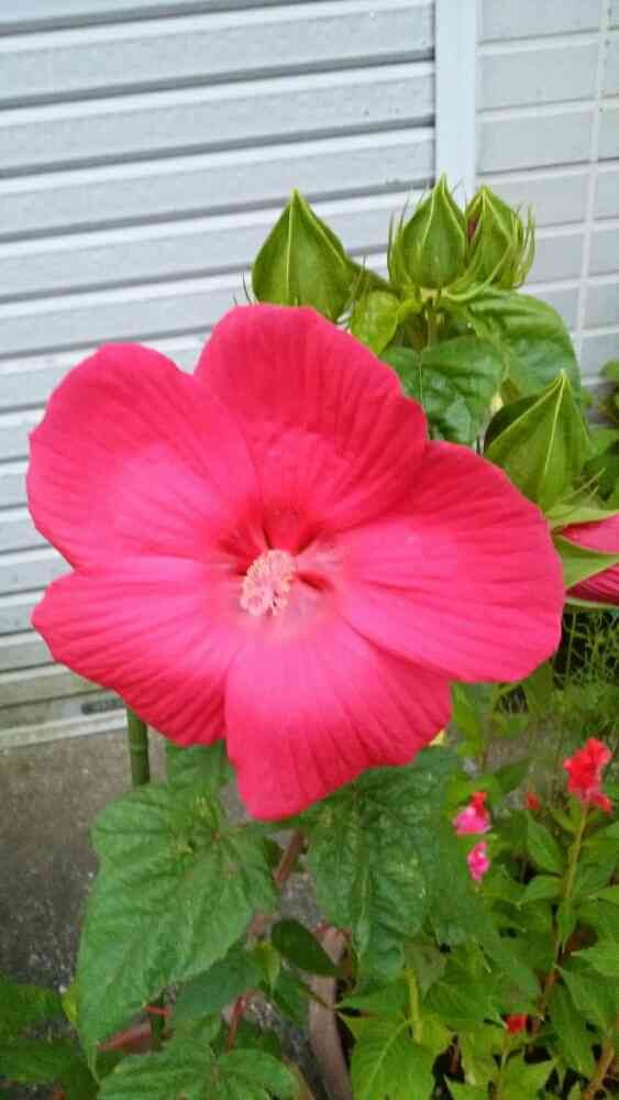 ご近所さんのお花です。とても落ち着いた赤のお花です。1日花だそうです。名前は分かりません。お知恵拝借です。