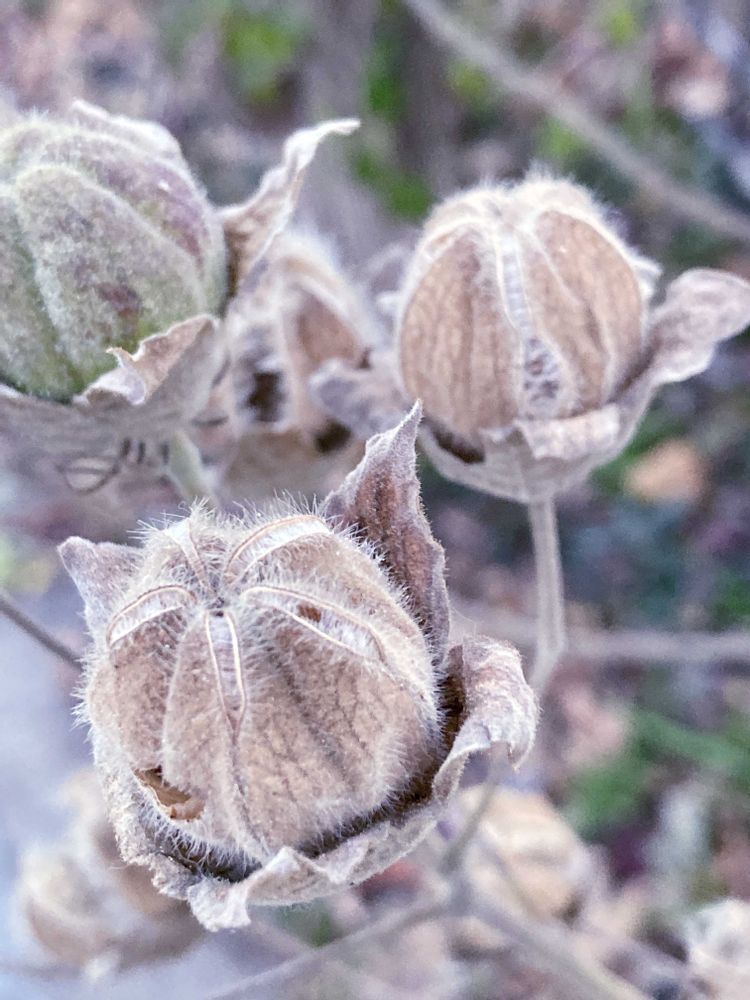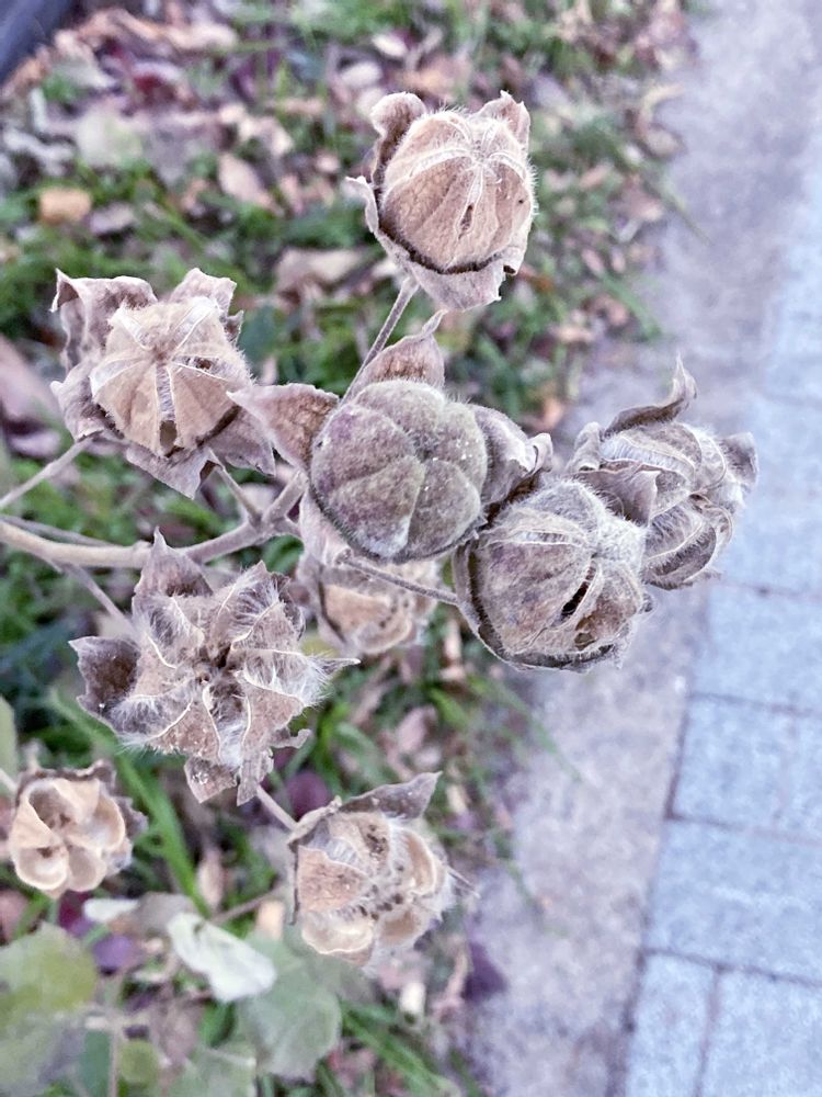 道沿いに生えている芙蓉。実が爆けているのや爆けそうなのや…。