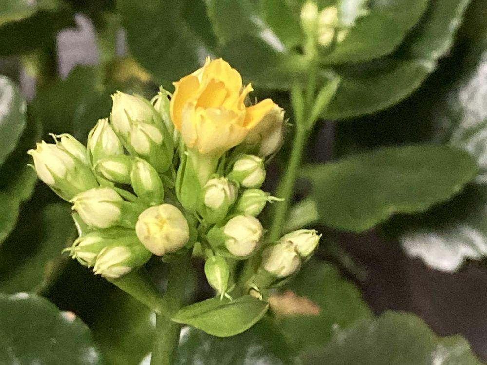 ②室内組のカランコエ、花茎が沢山伸びてきて花が少しづつ開いてきました♡