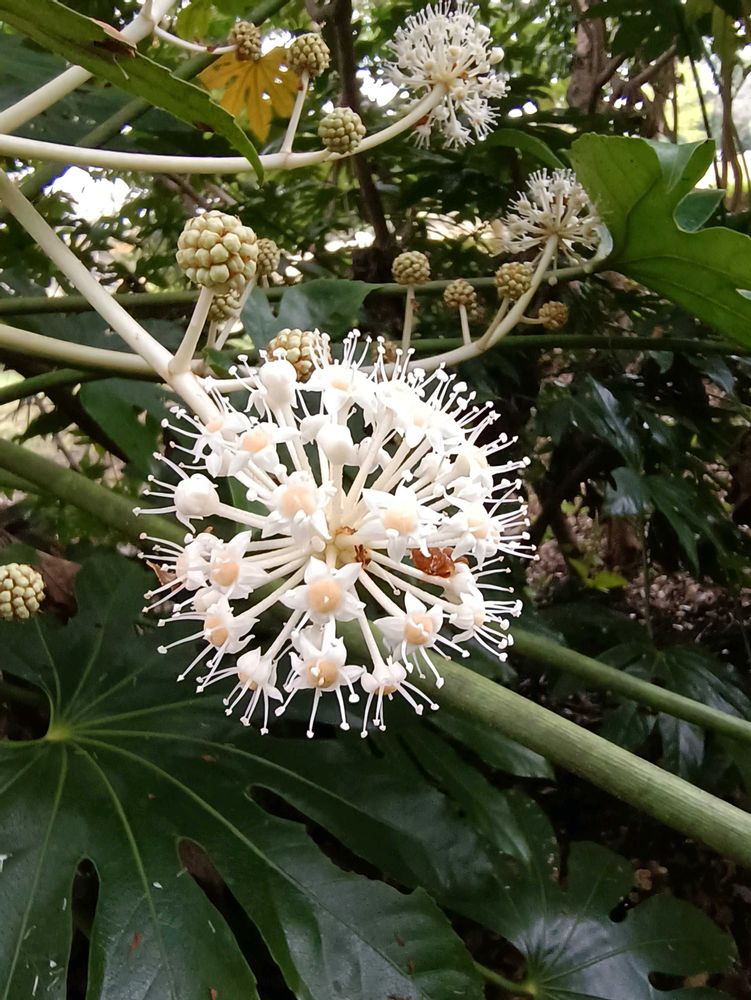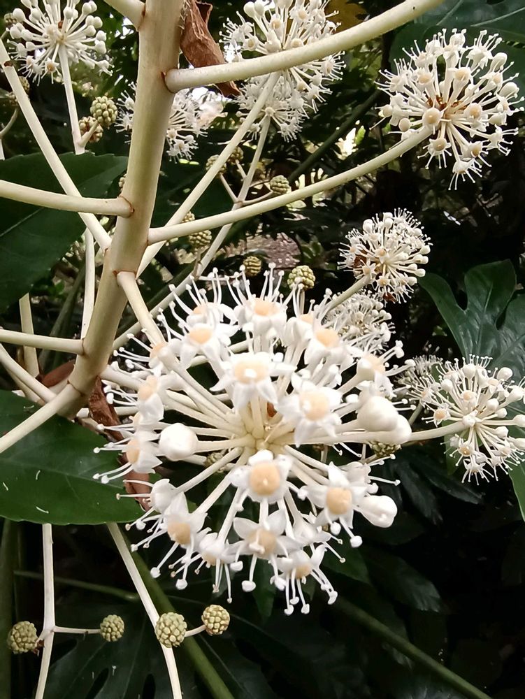 ヤツデの自生の分布って茨城県以南となっていますが、宮城でもあちこちで植栽されているのを見かけます♪開花はこちらと同じ感じですね!