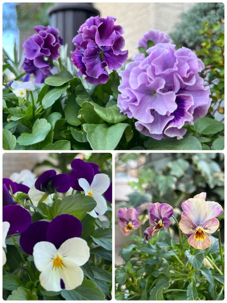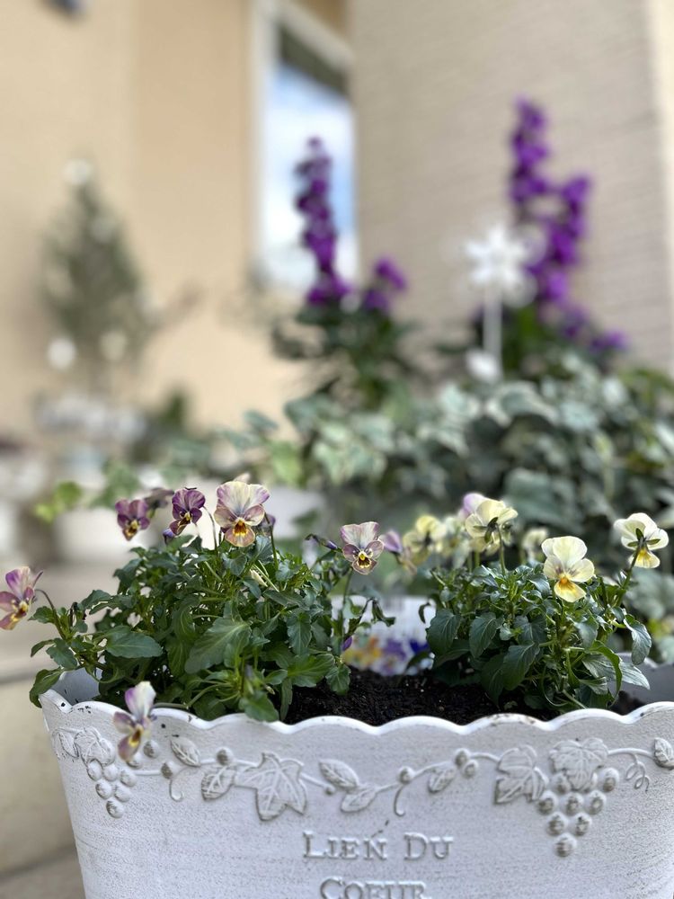 玄関先の可愛いパンジービオラ💜🤍💛