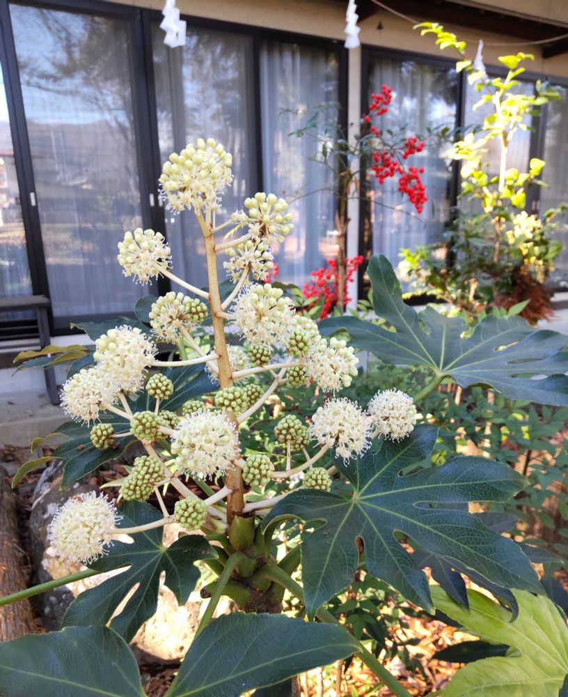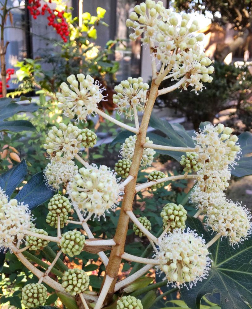 先日 お詣りさせて頂いた神社の社務所の前のヤツデです。