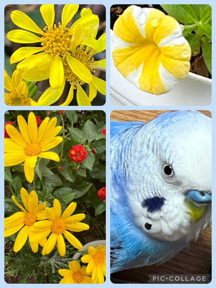 お花さん達と久しぶりのこれも幸せの青い鳥、セキセイインコのシータ君です。レンズが好きなので寄りすぎ!🤣もうすぐ6才
