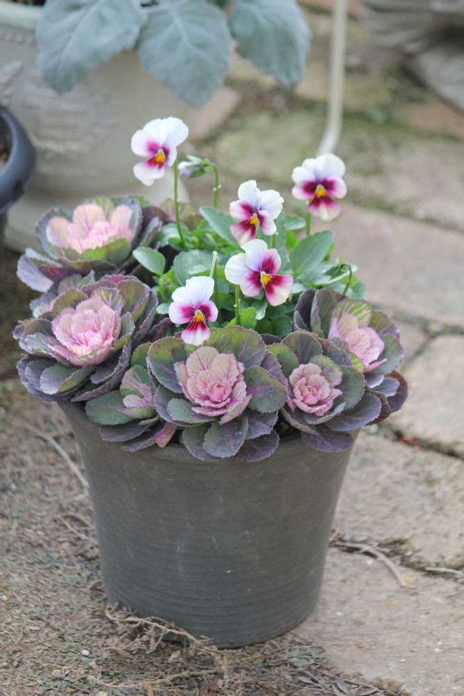 葉牡丹あかねとビオラエボルベ寄せ植えです☺️🌸