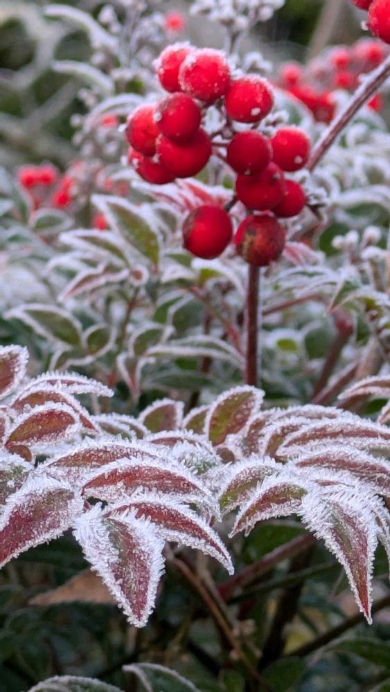 クリスマスローズ、ニゲラ、モミジ、ナンテン、五葉の松も凍てついている🧊🌱🧊