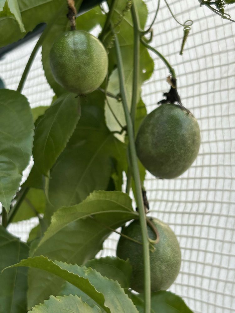 パッションフルーツ簡易温室の中です。赤くはならないけど、大きさは充分かな?