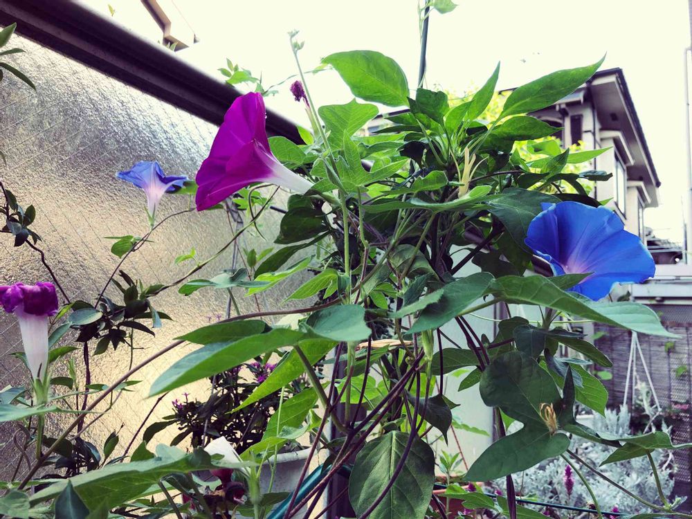 猛暑にも負けずに色違いの朝顔が咲き乱れていました。
