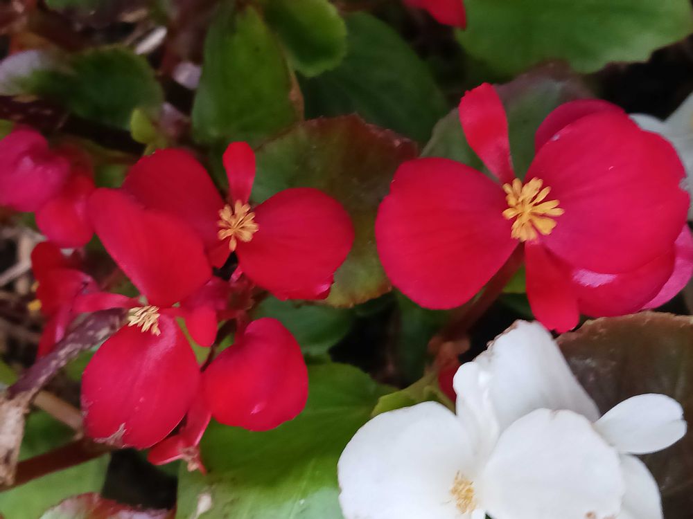 ベコニアの赤と白が咲いてます小さいけど、綺麗に咲いていました。我が家の庭です🤭