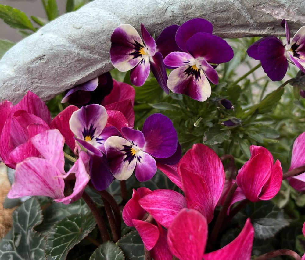 ①②先月作った寄せ植えのお花が増えて来ました♪細かいストライプのガーデンシクラメンとビオラのビオレッタ•シニョンズ✨シクラメン•クレヨンの色が濃くなり、ストライプがちょっとわかりにくいかな😊