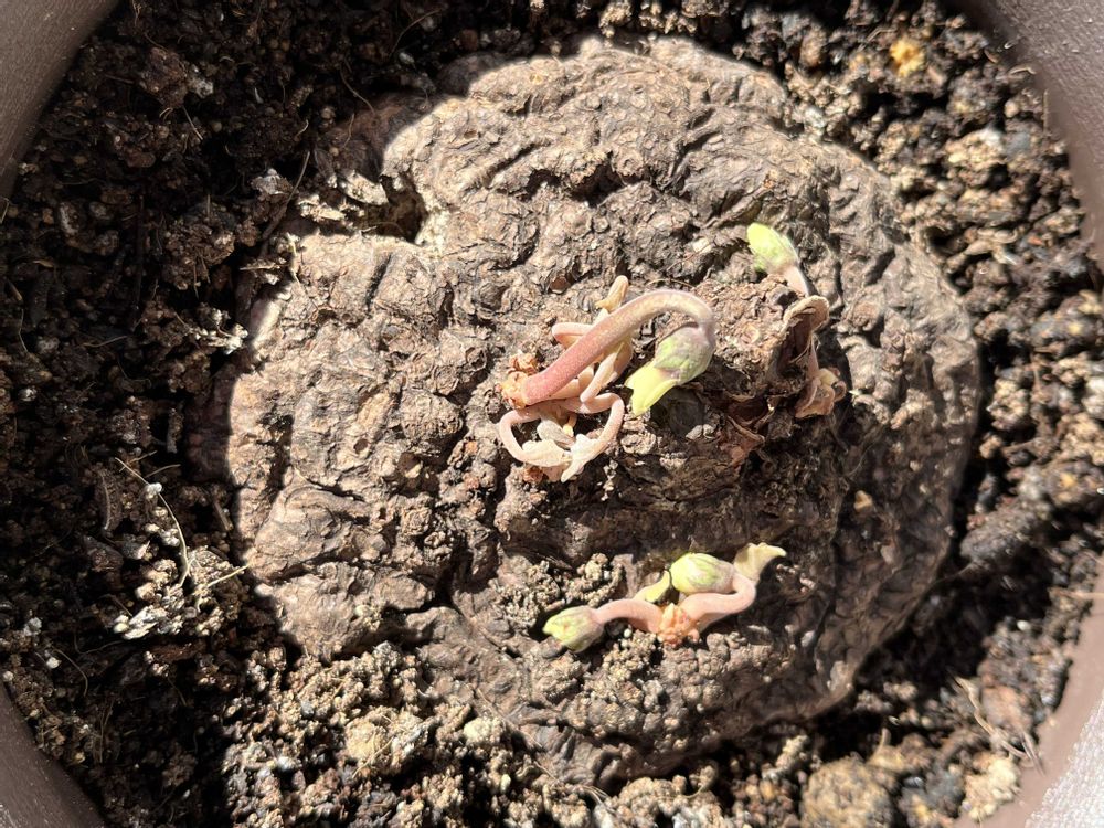意外と大きく手のひらサイズで裏は根っこも生えてなくてコンニャク芋っぽい。表に花芽が3箇所くらい出ていました。