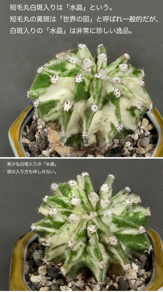 もう随分と以前に...サボテン業者の通販カタログで、たま〜に「水晶」と記載されたものを見つけ、注文したことがありましたが、送られてきた苗を見ると、白は白でもいわゆるバイラス斑と呼ばれる細菌によってできたマダラ状の白い斑点で、本来の斑入りとは異なるものでした。ガッカリでした…やっぱり「水晶」は幻か…と、ネット検索してもやはり出てきませんねえ…..。