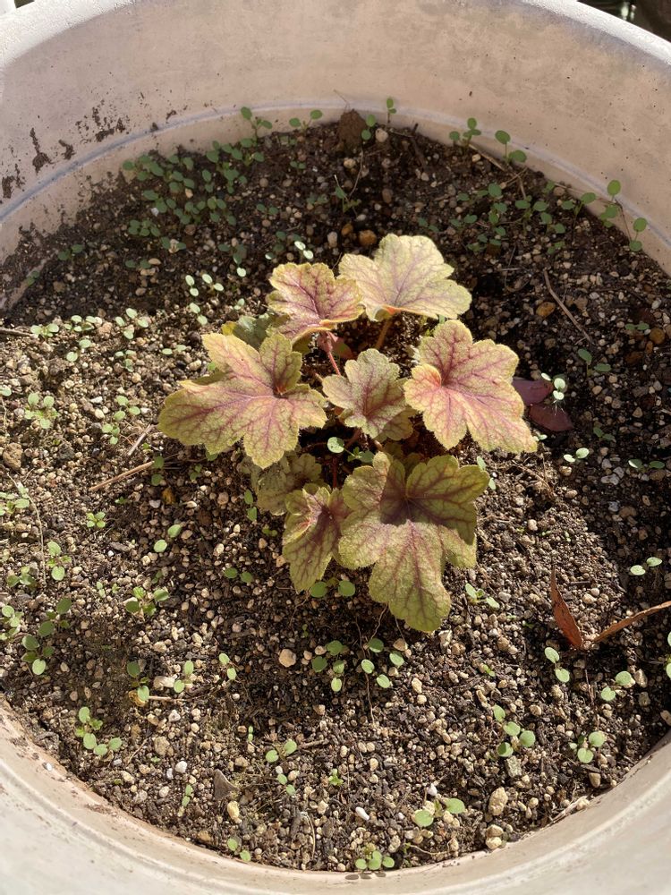 令和6年12月16日(月) ヒューケラ 名無し鉢🪴の今朝 ヒューケラ本体の変化は?葉脈の辺りの色が濃くなってるくらい? 周りの未だ何だか解らない🌱🌱🌱が😱いっぱい🤣🤣🤣🤣🤣🤣🤣