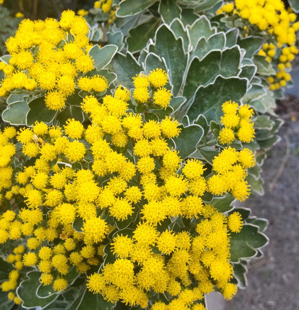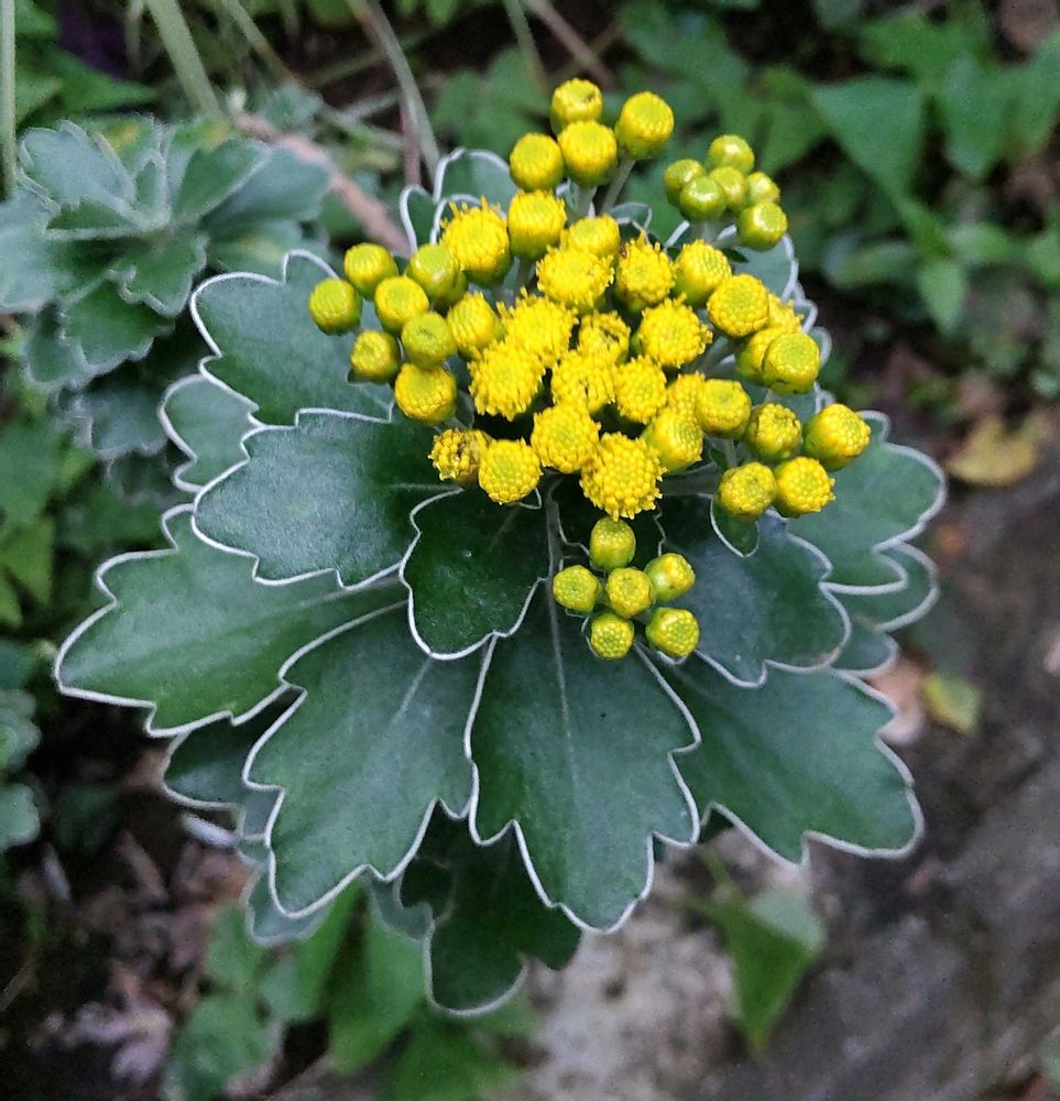 ① 白いエッジのある葉と咲き始めた黄色のお花が綺麗ですね🌼