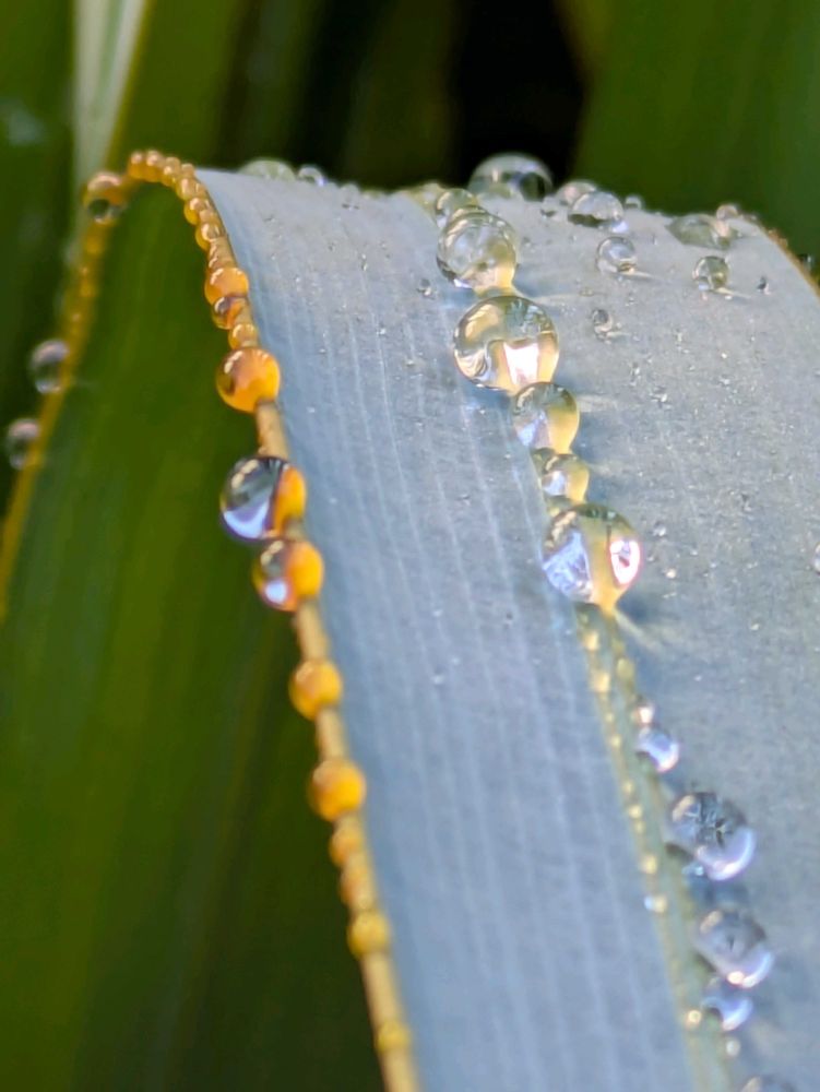 そのワトソニアの別の葉っぱにコロコロと乗っかって並んでいる雨粒の写真です。