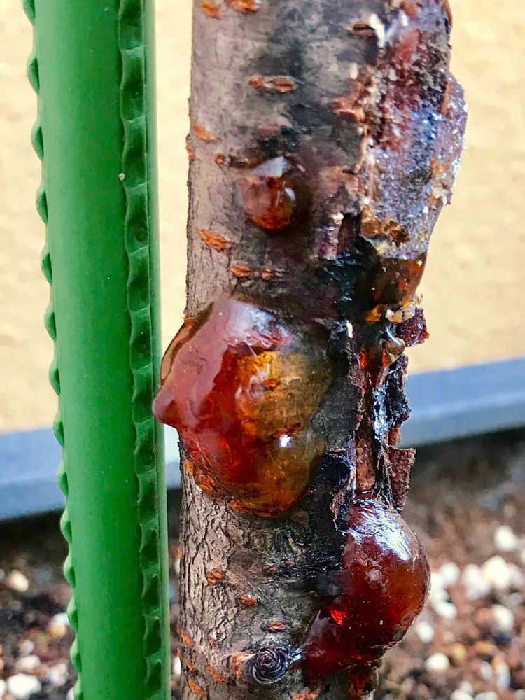 2m位に育ちましたが下の方に琥珀色のカチカチの樹液のようなものが😳