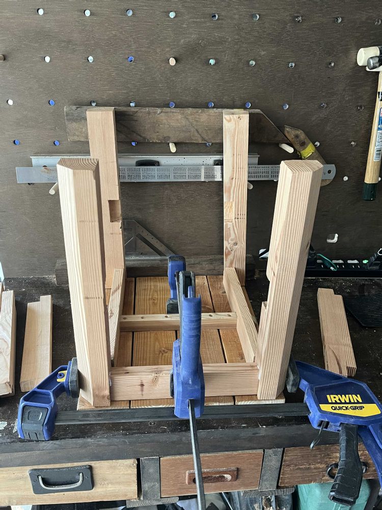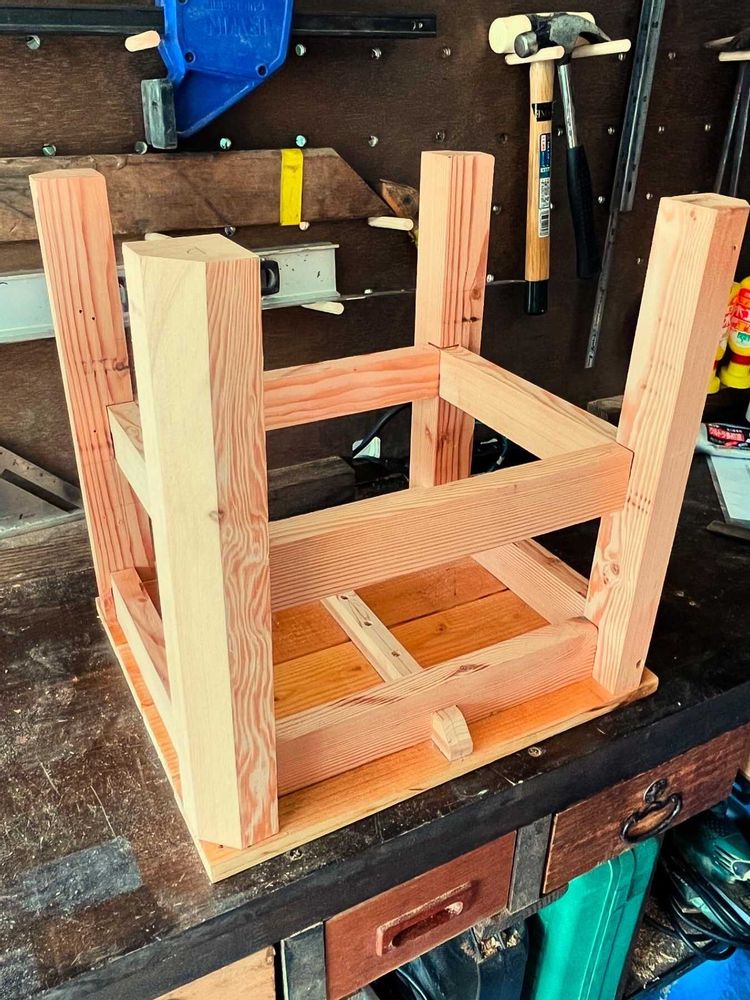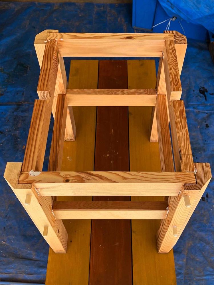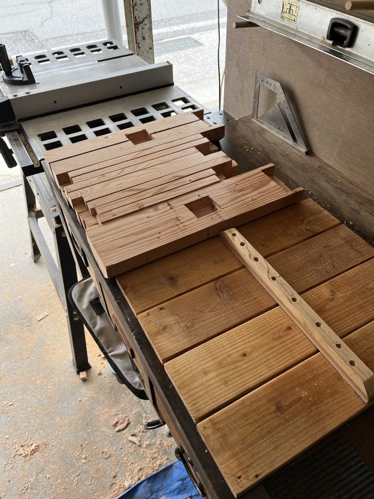 材料の加工が終了し(1枚目)、組み上げ作業です(2〜5枚目)。もう何を作っているか、お察しがついたかと思います😃 先日知り合いの木工業者さんと一緒に仕事をする機会があり、これらの写真を見せたところ、「大工さん、今時ホゾ加工なんて木工屋でもやりませんよ」との事。ダボ継ぎの方が手間がかからず、主流なんだとか! 早く教えてくれよ!😂