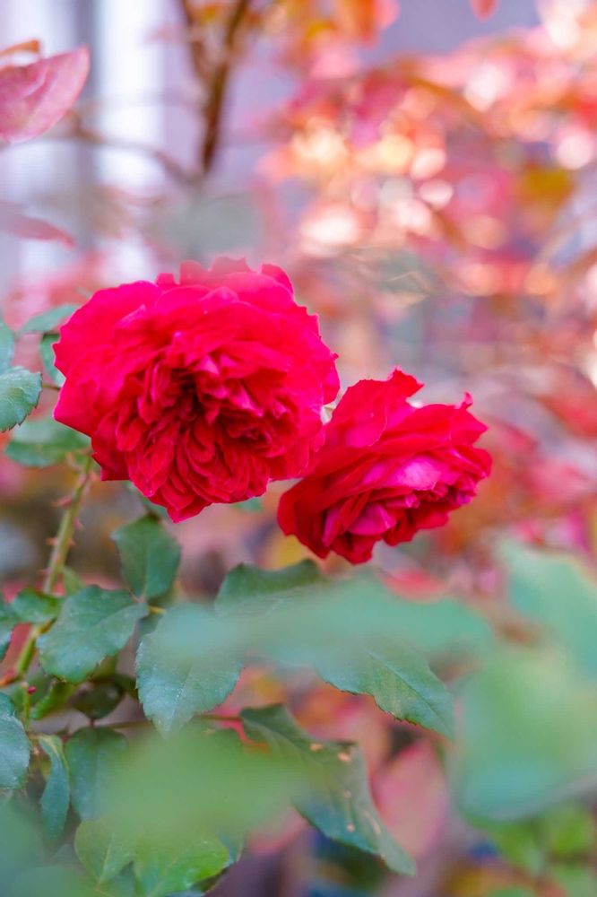 ブルーベリーの紅葉と赤い薔薇の組み合わせ美しい❤️