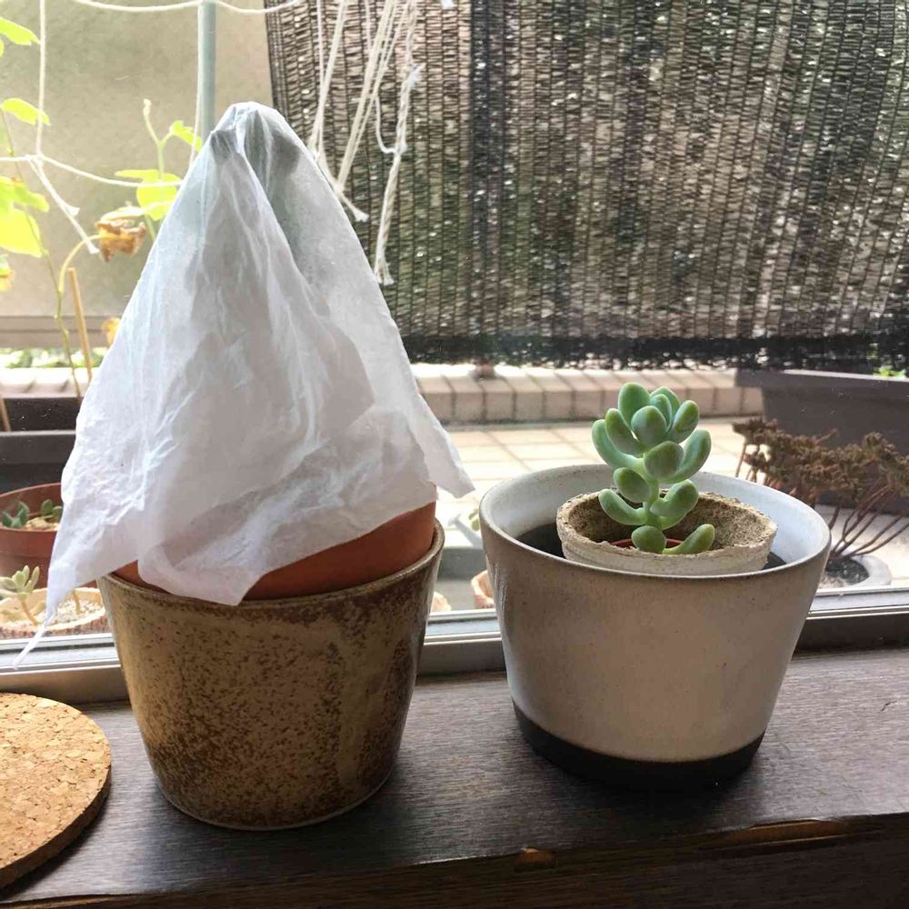 鎌倉からお迎えしたお二方。環境に慣れていただくため、室内のエアコン環境にいたサボテン、福禄竜神木には、ティッシュに霧吹きをして、我が家のまずは窓辺で1週間。本で、鶴仙園の方がおすすめしていた方法。はじめて試してます。