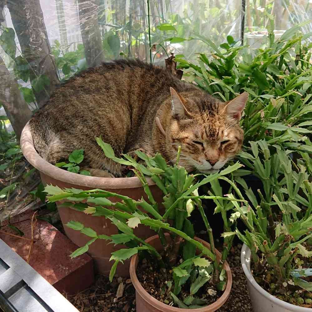 鉢に植わってるといっぱい構ってもらえるらしい、じゃ自分も。。。って上がり込んだのかも(*´艸`)