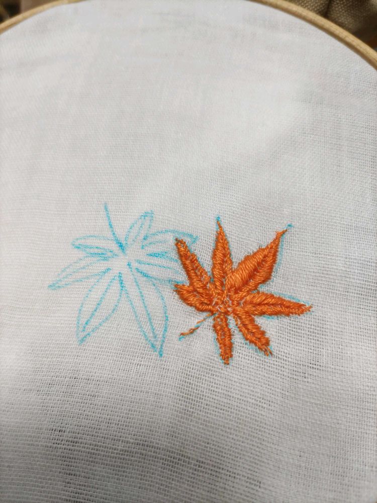 もみじ🍁の刺繍。ひとつ仕上がりました。近くでは見ないで〰️荒いから〰️😅
