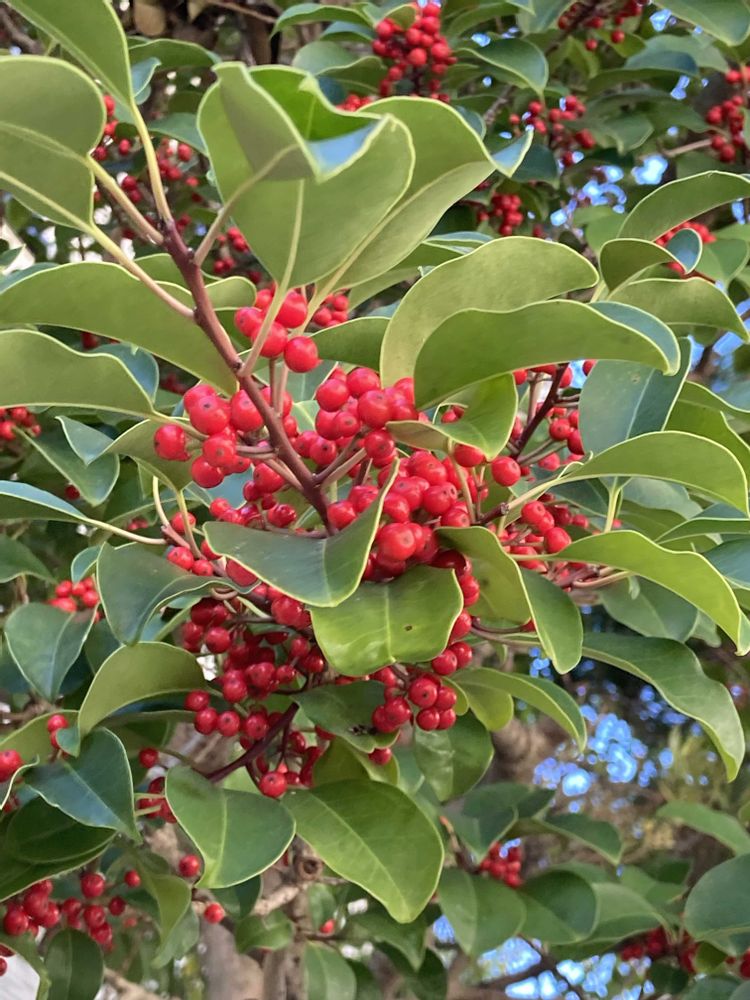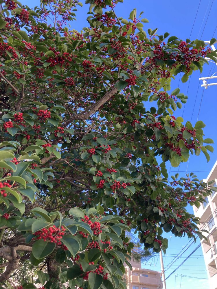 学校近くのお家のクロガネモチの赤い実がいっぱい咲いてます。