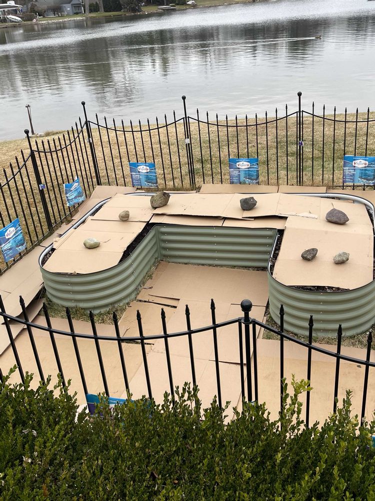 レイズドベッド周囲の芝を枯らすためにダンボールを敷いておきます
