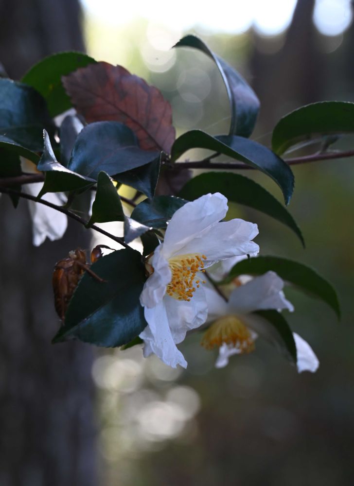 原種のサザンカは、 花弁が5〜7枚で白色、 香りで虫を呼びます。