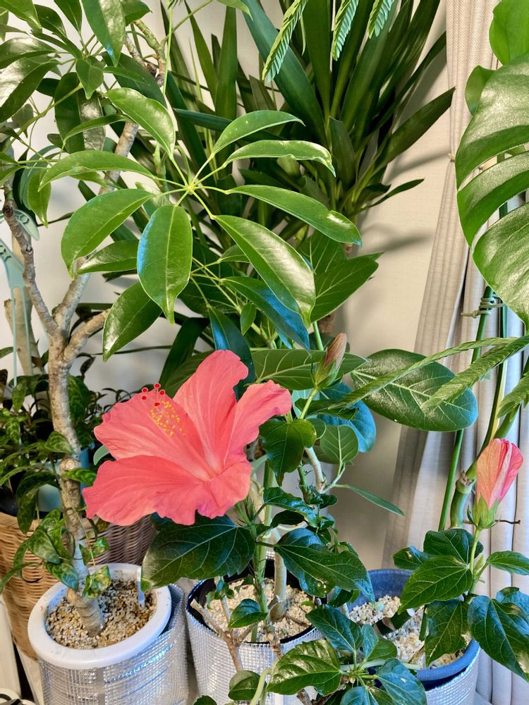 今日のハイビスカス🌺初号機インドアハイビスカスサニーシティ🌺お気に入りのシェフレラさんと😊