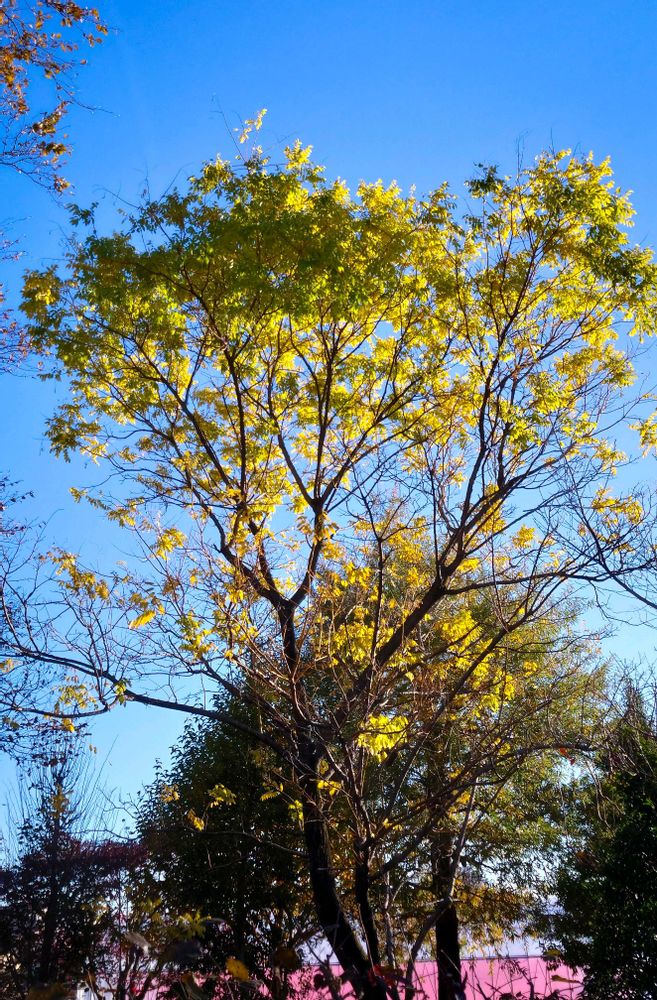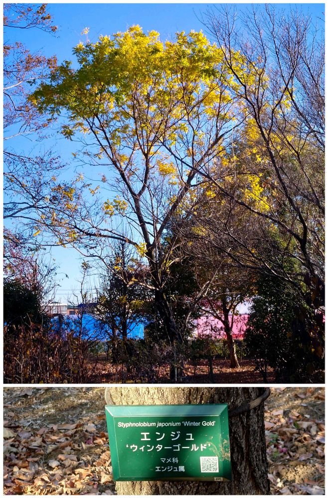 冬枯れの季節でも、この木には関係ないようです😀 この時期に若葉色の葉っぱを輝かせています🤩 「エンジュ ウィンターゴールド」というんですね🧐 なるほど、黄金色にも見えます🏅🥳(農業試験場内にて)