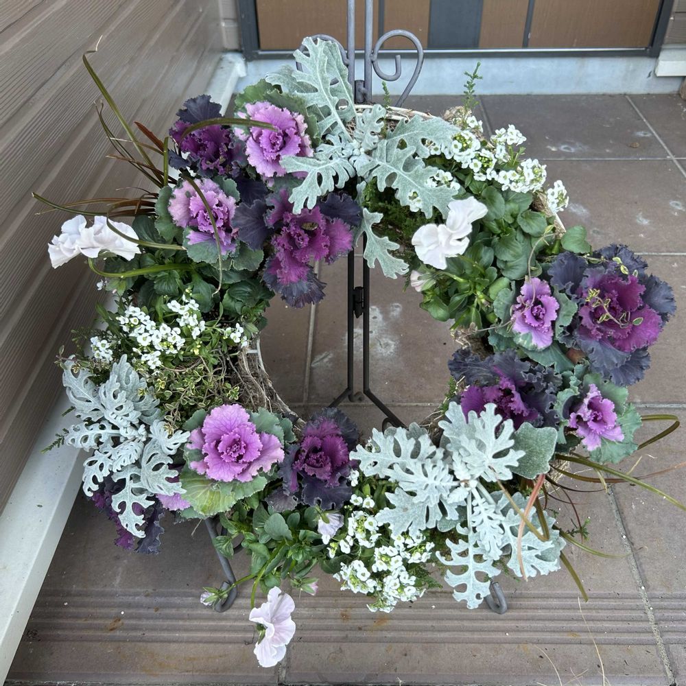 紫のハボタンとフリルビオラ、シロタエギクでシックな雰囲気にしました^ ^