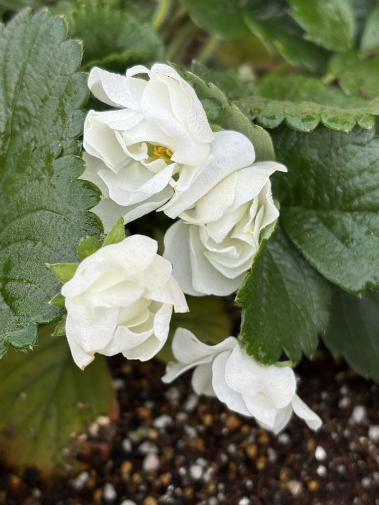 いちご🍓の花で八重があるのですね、始めて見ました。最初、ジュリアンかと思いました。かわいい😍
