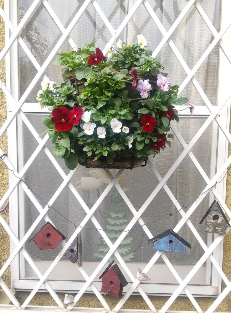 古いワイヤーバスケットを使っています。お花はパンジーとビオラ。まだ完全型ではありませんが年内には何とか…丸くなってくれるかなぁ🍀