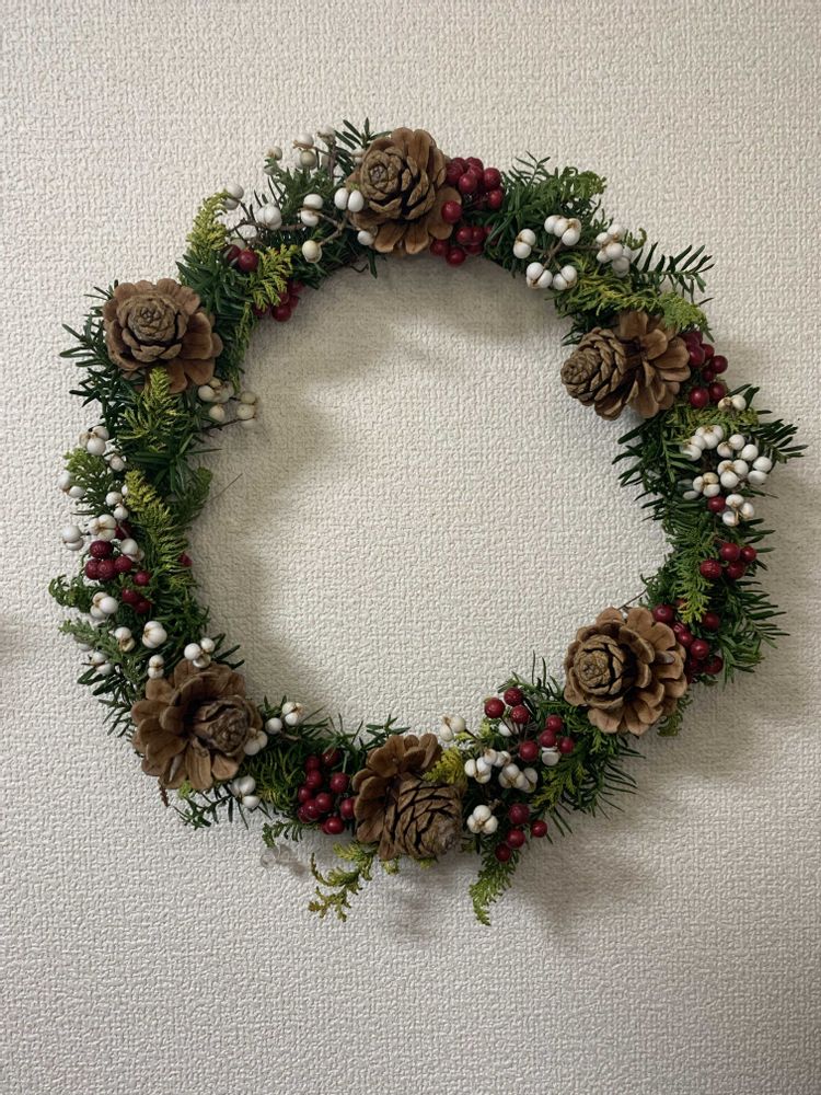 田舎の庭からイチイやヒノキや松ぼっくりを、近所の公園からナンキンハゼの実を集めて、良い感じに完成😆✨