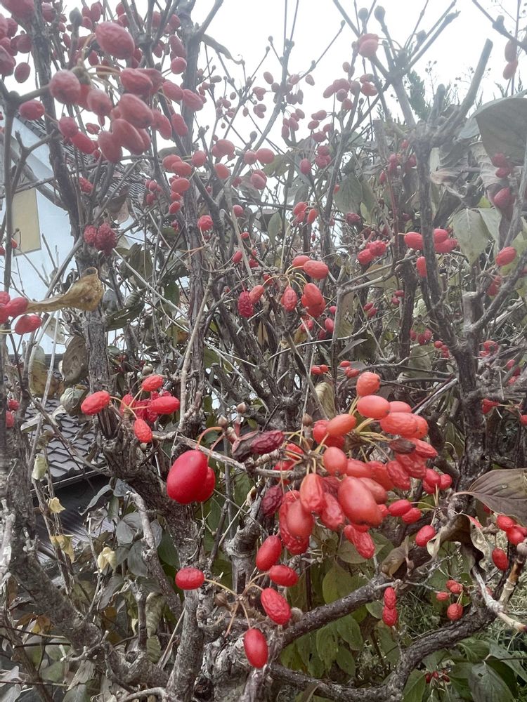 ①②③④実家の冬の景色。サザンカ、サンシュユの真っ赤な実。