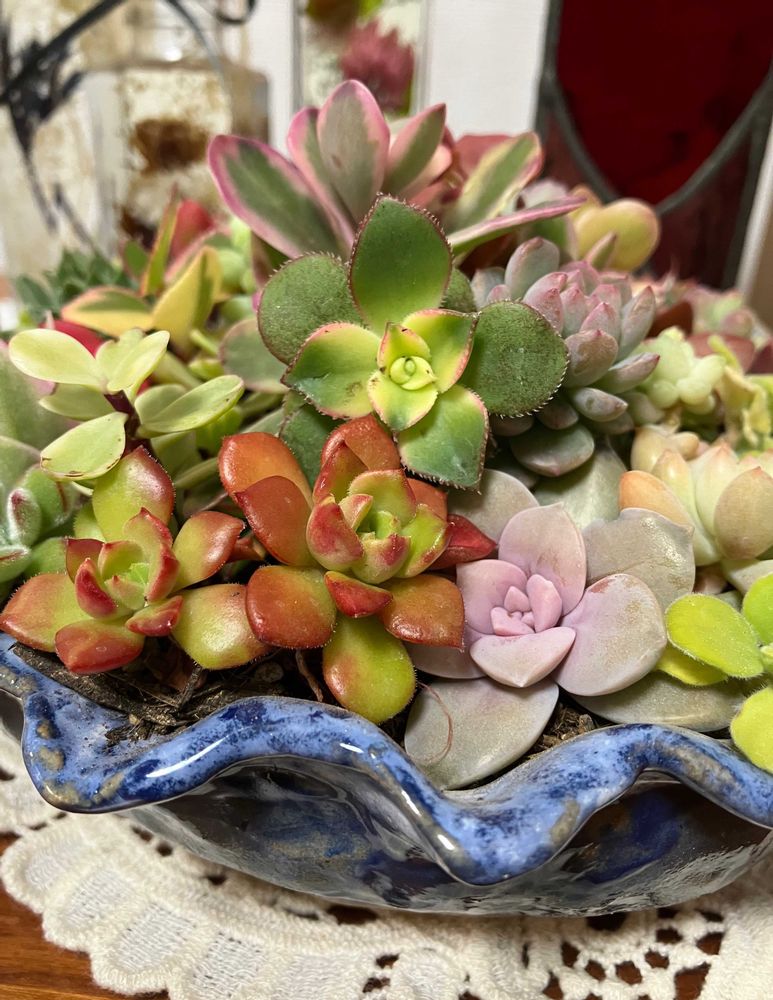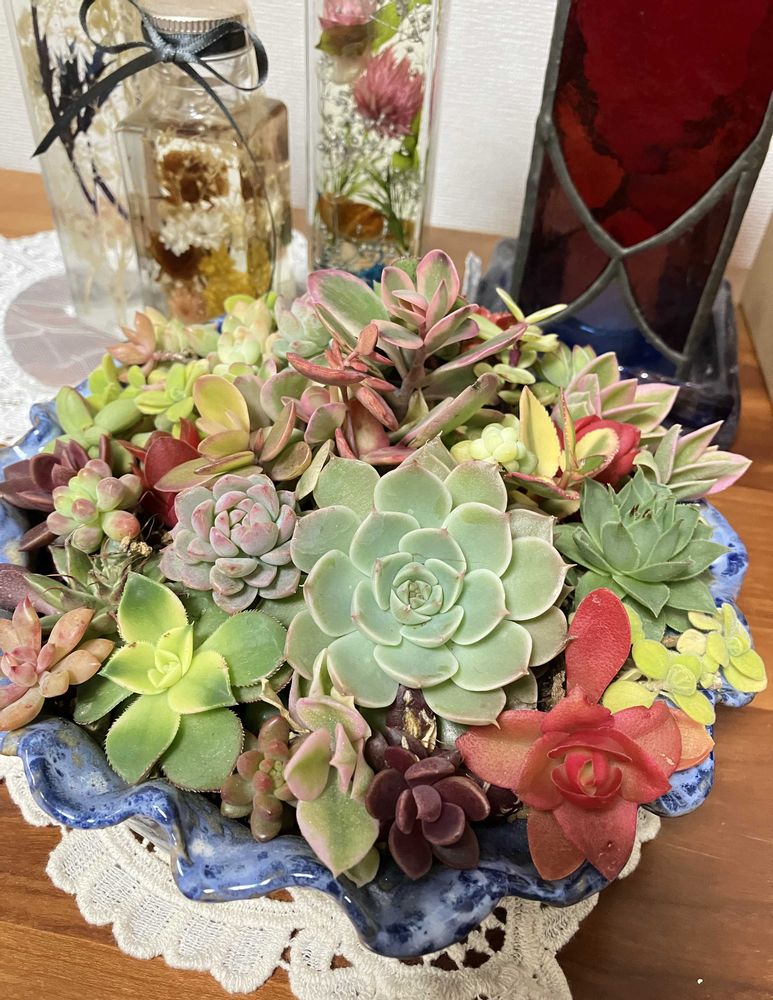 鉢を減らすつもりで多肉植物をたくさんお嫁に出したのに、ついでに我が家の寄せ植えを作ってしまい一鉢増えました😄